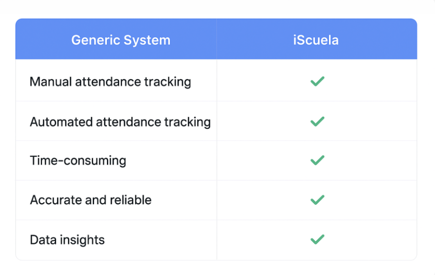 Unlike basic tools, iScuela combines end-to-end automation, online attendance systems and human support into one platform.